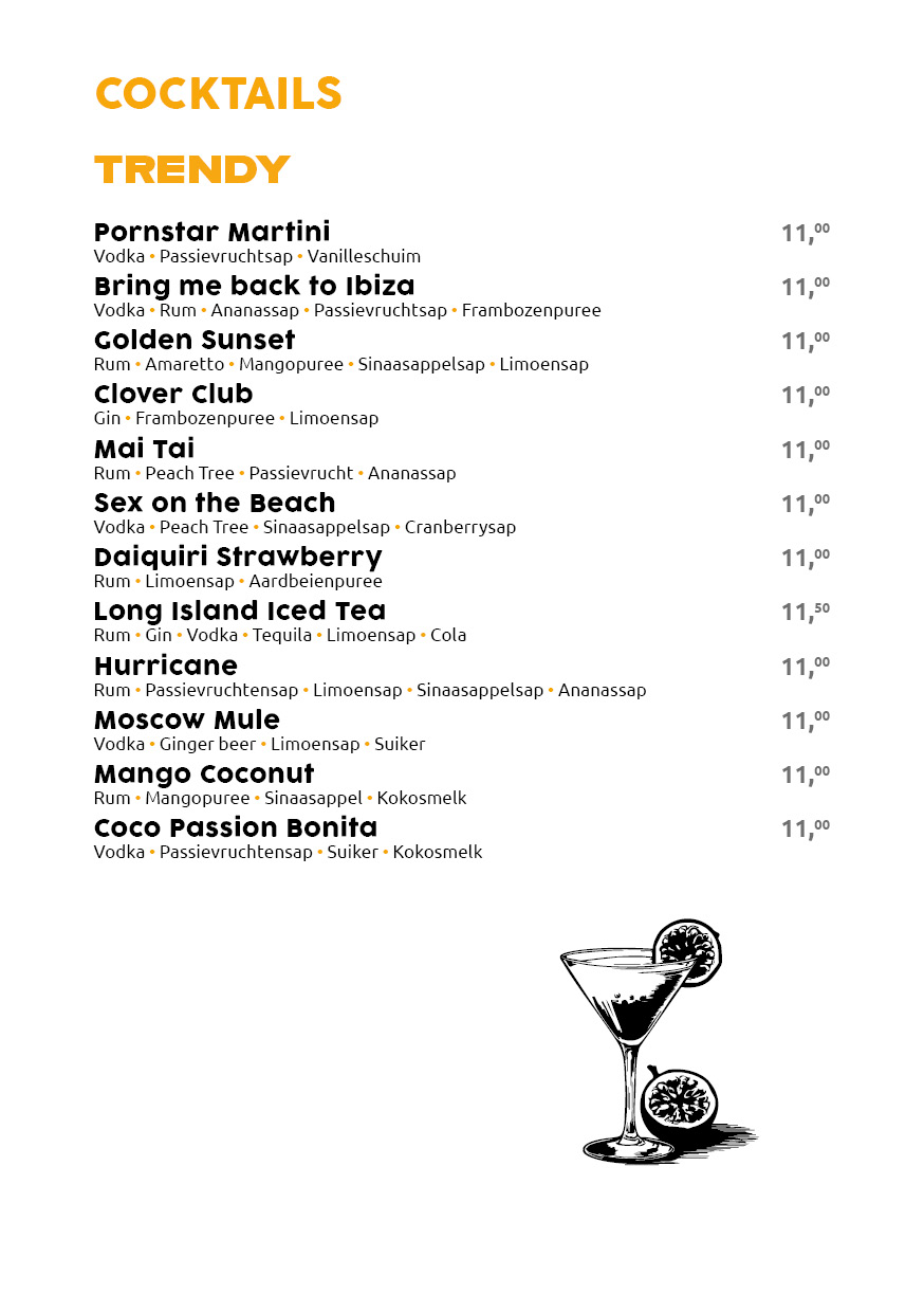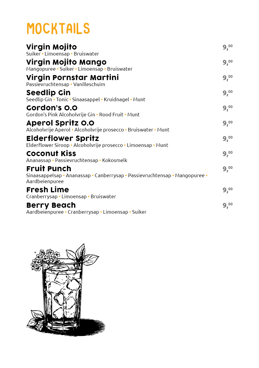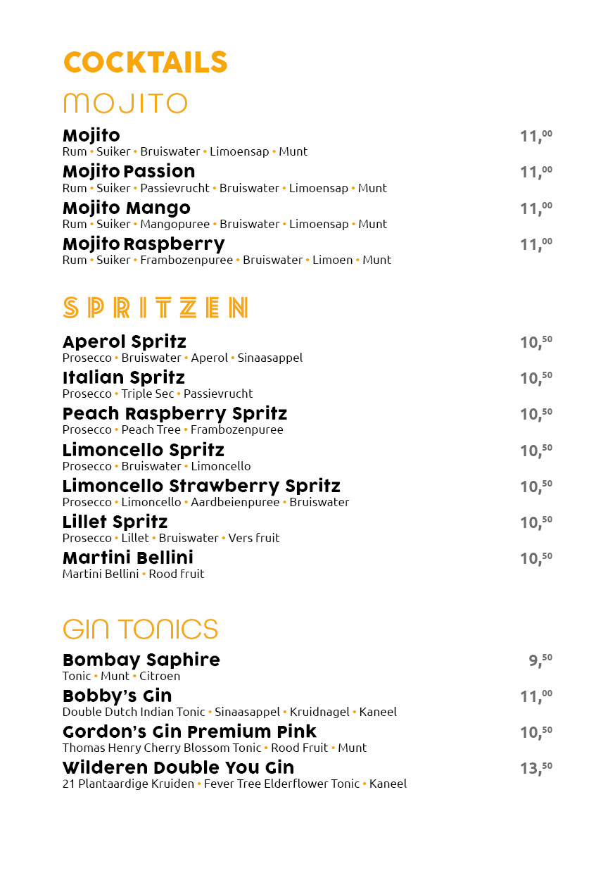 Maak een keuze uit de ruim 30(!) soorten op onze cocktailkaart. Met daarop bekende cocktail klassiekers zoals de Mojito, Margarita en Aperol Spritz, maar ook diverse Gin Tonics en vele frisse Mocktails. En wat te denken van een Hurricane, een Mango Coconut of een Bring Me Back To Ibiza.